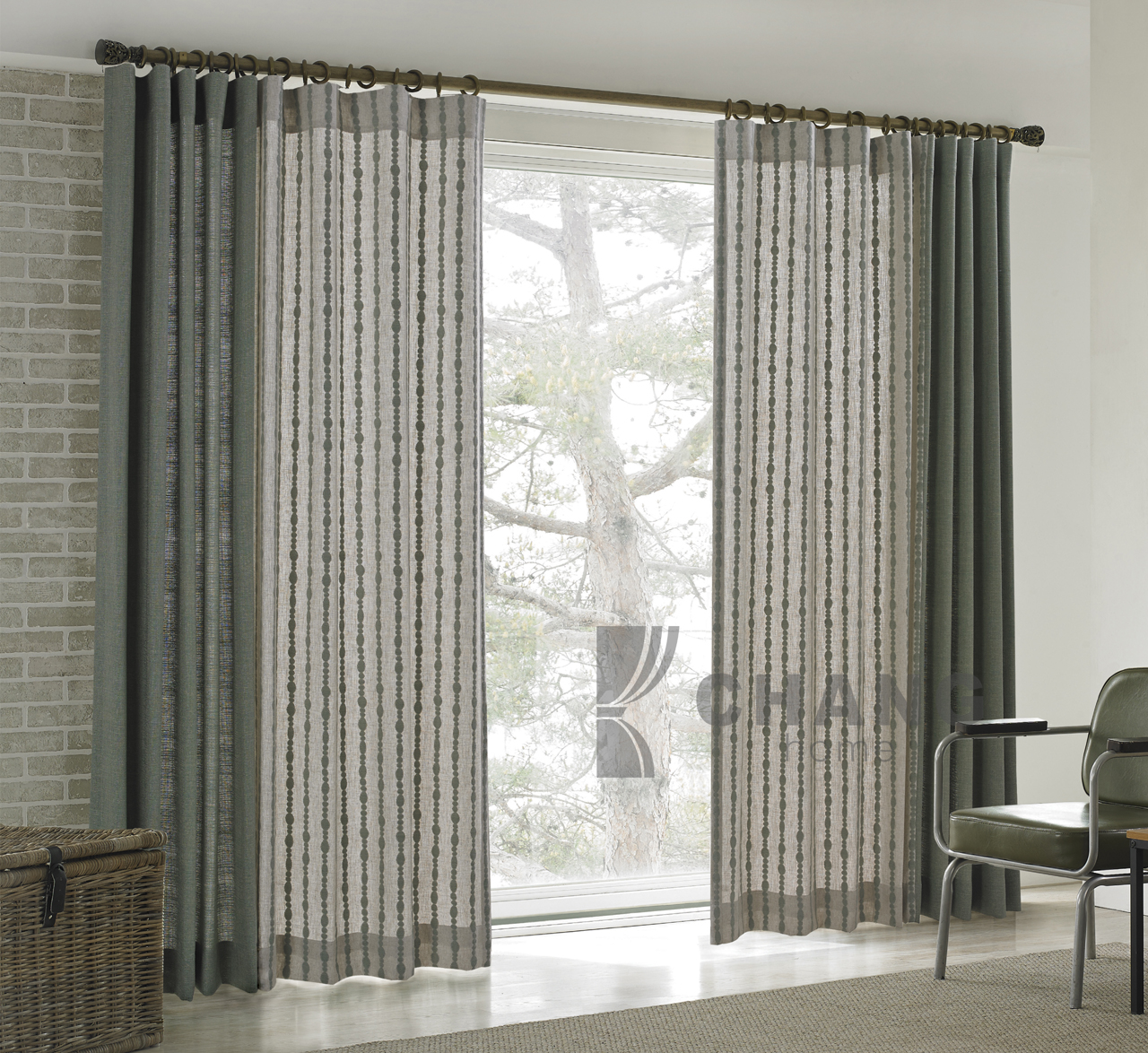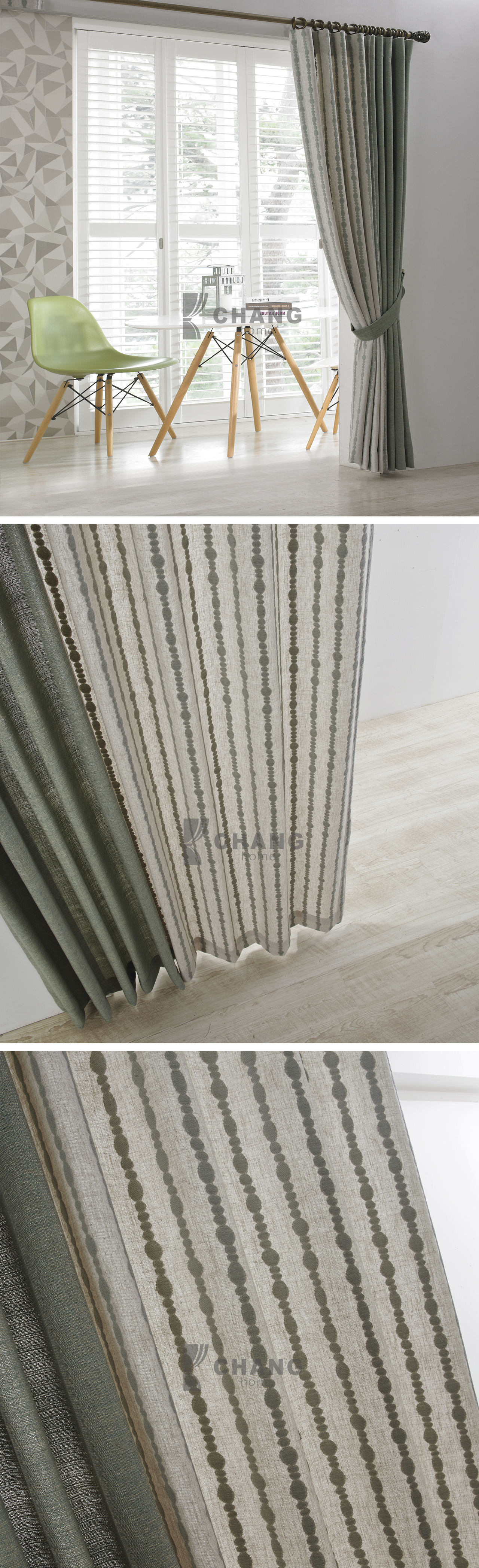 차분한 그레이 솔리드 패브릭과 린넨 자수로 연폭한 디자인커튼.