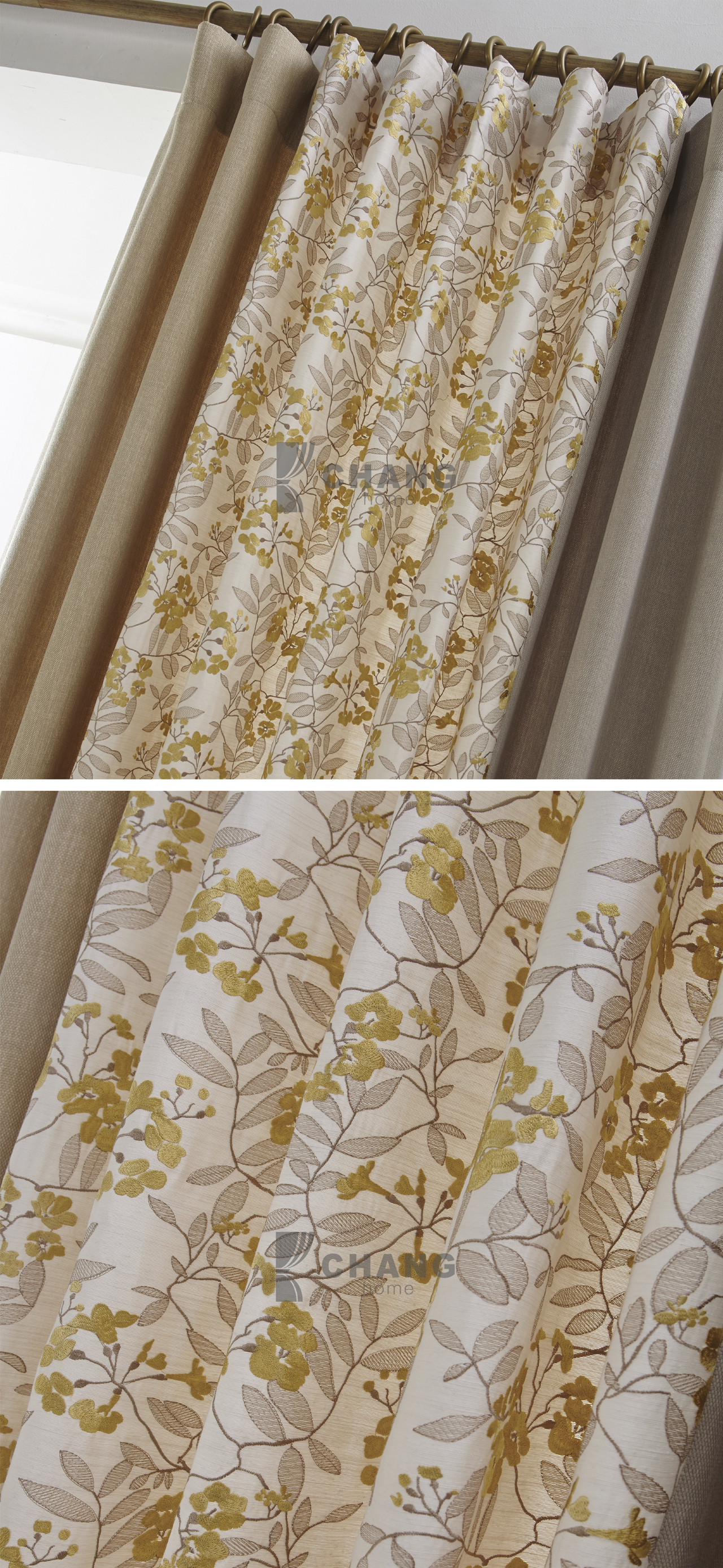 화사한 플라워 패턴 자수와 베이지 솔리드 패브릭.